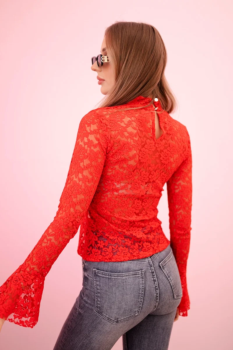 Stilinga ir itin moteriška moteriška palaidinė, pagaminta iš elegantiškų nėrinių. Dėl subtilaus rašto ir prigludusio kirpimo ji puikiai pabrėžia figūrą, suteikdama aprangai ypatingą charakterį. Modelis turi ilgą rankovę su švelniu raukiniu rankogalyje, o stovas su sagute suteikia elegancijos. Puikus pasirinkimas ypatingoms progoms, pasimatymams ar vakariniams pasivaikščiojimams. Puikiai dera tiek prie kelnių, tiek prie sijonų, sukuriant įspūdingą įvaizdį. Dydis universalus ir tinkamas S, M arba L dydžio moterims.