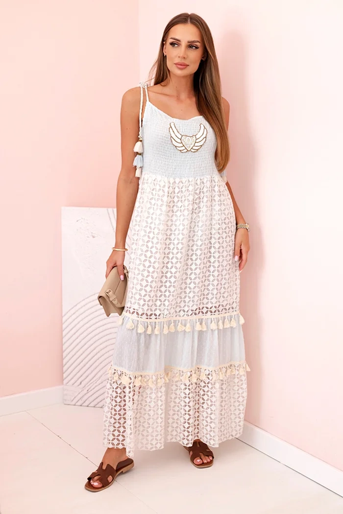 Ši boho stiliaus moteriška suknelė – puikus pasirinkimas šiltoms dienoms, kai norisi atrodyti moteriškai, laisvai ir stilingai. Pagaminta iš 100 % medvilnės, užtikrina komfortą ir oro pralaidumą visą dieną. Viršutinė dalis papuošta išskirtine sparnų formos siuvinėjimu bei dekoratyvinėmis kutais puoštomis juostelėmis ant petnešėlių, suteikiančiomis unikalumo. Apačia iš švelnios nėrinių medžiagos su geometriniu raštu, pertraukiama kutais puoštomis klostėmis, pabrėžia lengvumą ir romantišką stilių. Puikiai tinka vasaros pasivaikščiojimams, atostogoms ar festivaliams. Suknelė puikiai dera su sandalais, espadrilėmis ar šlepetėmis. Dydis universalus – tinka nešiojančioms S, M arba L.