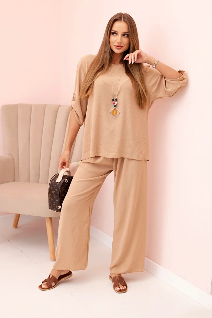 Šis stilingas moteriškas komplektas – puikus pasirinkimas moterims, vertinančioms patogumą ir eleganciją kasdienėje aprangoje. Komplekte yra laisvi marškinėliai su 3/4 rankovėmis, kurias galima reguliuoti mygtuku, bei platūs kelnės su guma ir raišteliu, užtikrinančios judėjimo laisvę ir puikų prigludimą prie figūros. Įvaizdį papildo originalus kaklo papuošalas, suteikiantis stiliui išskirtinumo. Komplektas puikiai tinka tiek kasdienai, tiek susitikimams, pasivaikščiojimams ar laisvesnėms darbo dienoms. Dėl universalaus kirpimo ir neutralių spalvų lengvai derinsite su mėgstamais aksesuarais ir avalyne. Dydis universalus – tinka S, M arba L dydžiams.