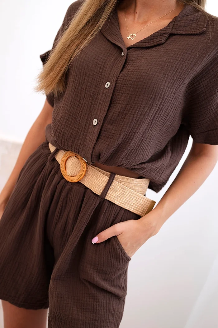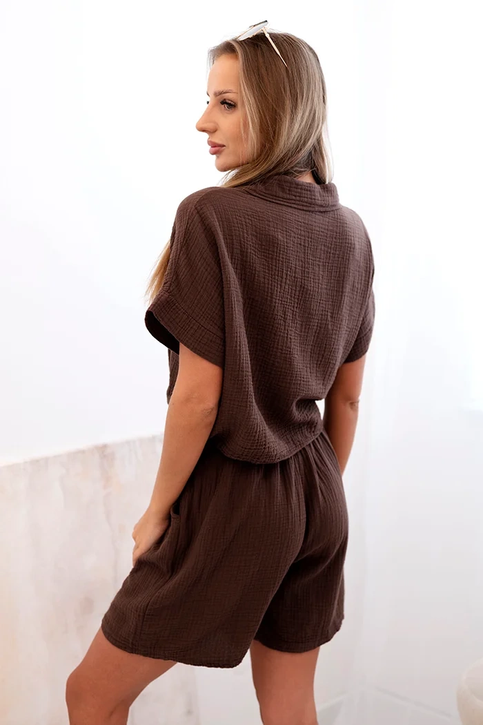 Stilingas moteriškas muslino komplektas – puikus pasirinkimas šiltoms dienoms! Komplektą sudaro trumpi marškiniai su mazgu apačioje ir laisvi šortai su elastingu juosmeniu ir dekoratyviniu diržu, užtikrinantys patogumą ir madingą išvaizdą. Natūrali, kvėpuojanti medvilnė puikiai tinka atostogoms, pasivaikščiojimams ar kasdieniam poilsiui. Laisvas marškinių kirpimas ir platūs šortų klešnių kraštai suteikia judėjimo laisvę ir komfortą visą dieną. Komplektą galima dėvėti kartu arba atskirai, todėl tai labai universalus vasaros garderobo elementas. Italų gamyba – kokybė, kuria galite pasitikėti. Dydis universalus – tinka S, M arba L dydžiams.