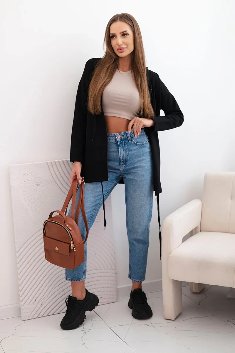 Moteriškas džemperis su gobtuvu ir raišteliu apačioje juoda