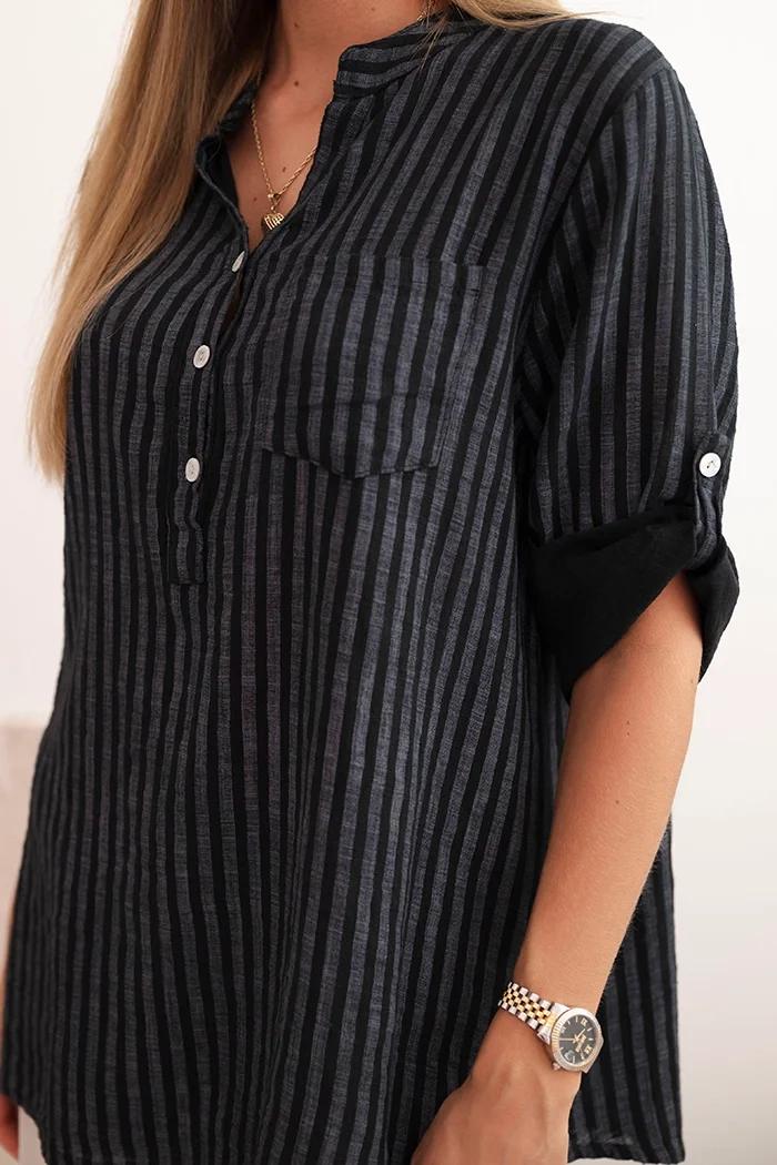 Ši moteriška palaidinė yra puikus pasirinkimas šiltoms dienoms, derinantis lengvumą su dėvėjimo komfortu. Pagaminta 100% iš natūralios medvilnės, užtikrina pralaidumą orui ir minkštumą, todėl tiks tiek kasdieniam naudojimui, tiek vasaros išvykoms. Būdingas laisvas kirpimas leidžia laisvai judėti, o rankovės juostelė leidžia užsivilkti rankoves ir stilizuoti pagal savo poreikius. Praktiškas kišenė priešakyje suteikia visumai neformalaus, kasdieninio žavesio. Palaidinė be apykaklės su lengvu dekoltu, užsegama ant mygtukų, puikiai tinka vasaros tendencijoms. Italijos gamyba garantuoja aukštą kokybę ir dėmesį detalėms. Dydis yra universalus ir tiks moterims, turinčioms S, M ar L dydį.