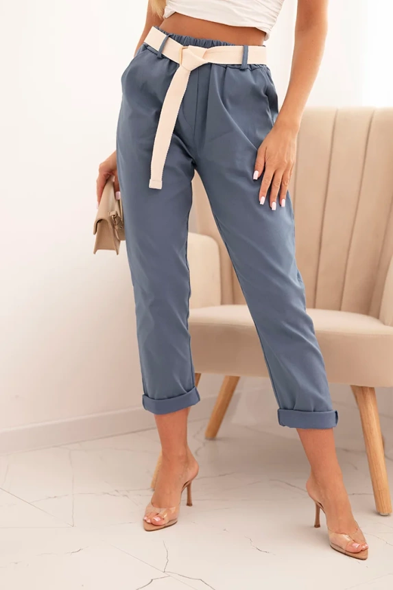 Moteriškos viskozės kelnės su diržu ir sukeltu klešnių kraštu tamsiai džinsinės