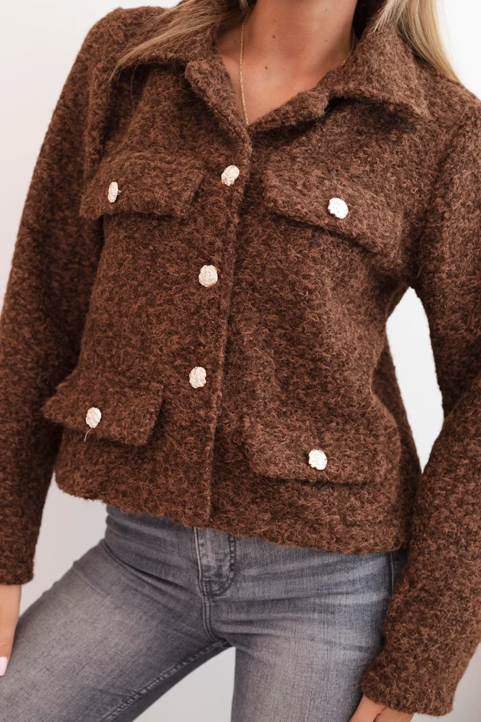 Stilinga moteriška striukė su vilnos priemaiša yra ideali elegancijos ir patogumo kombinacija vėsesnėms dienoms. Pagaminta iš minkštos medžiagos su švelnia pūkuota tekstūra, ji atrodo labai efektingai, o tuo pačiu yra nepaprastai patogi dėvėti. Klasikinis apykaklė, dekoratyvinės kišenės su atlapais ir auksiniai mygtukai suteikia jai šarmo ir modernumo.
