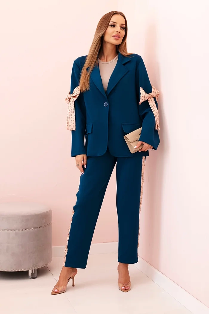 Moteriškas komplektas su viskoze – švarkas su atvartais ir kelnės su jūros mėlyna juostele mėlyna