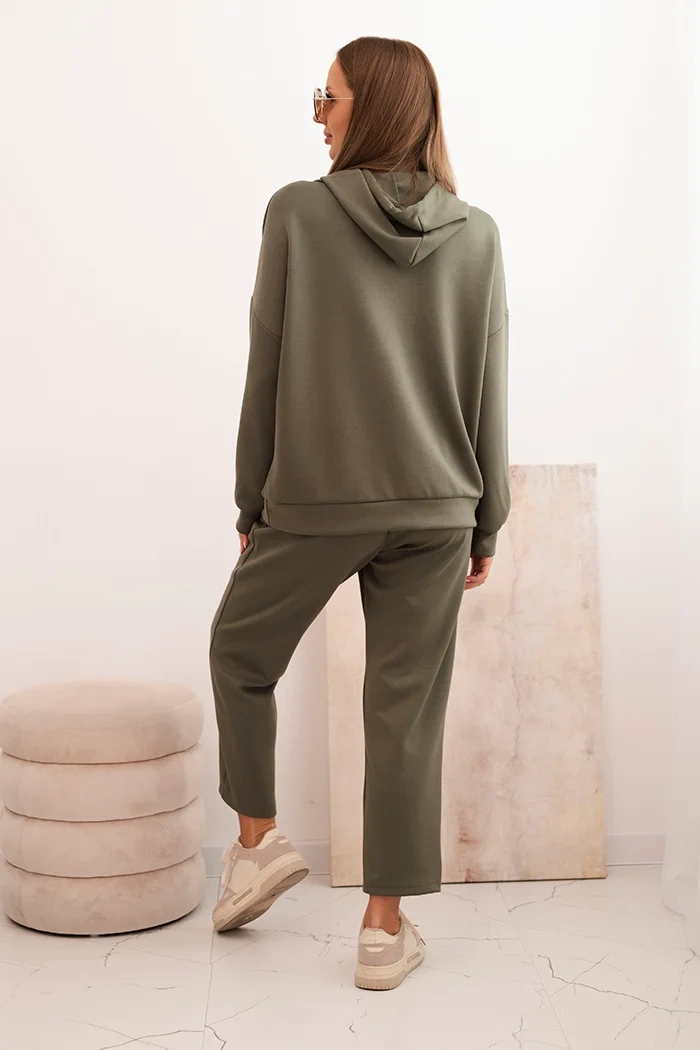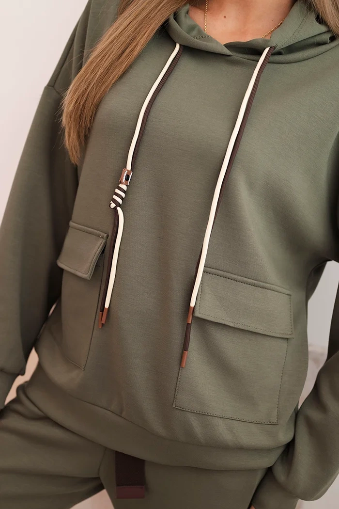 Moteriškas komplektas su sviestiniu gobtuvu ir kelnėmis su diržu khaki