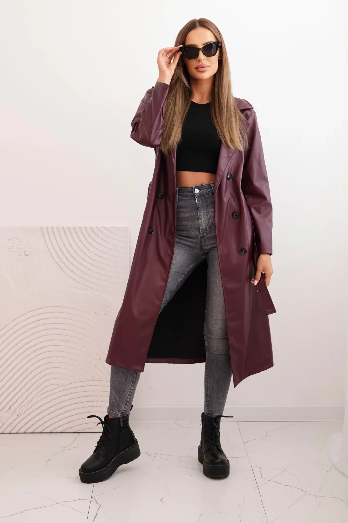 Moteriškas trench paltas iš ekosuodinio su diržu ir apykakle bordo