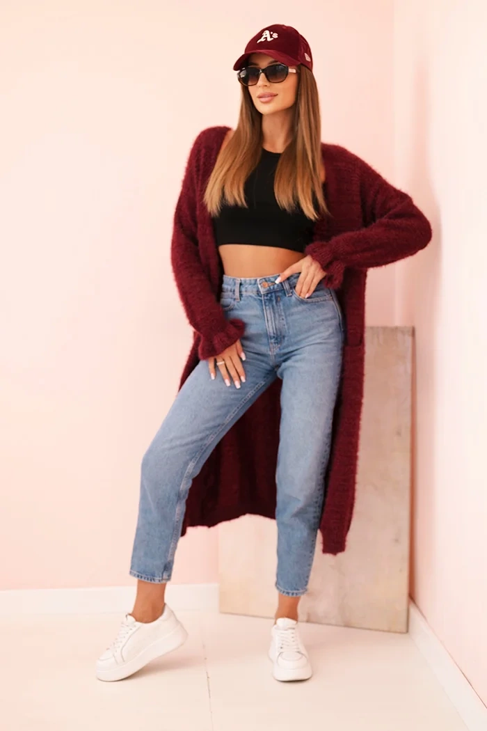 Moteriškas moherinis kardiganas ilgo kirpimo su kišenėmis slyvų