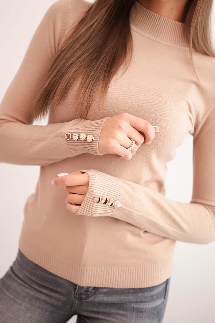 Elegantiškas moteriškas megztinis iš viskozės yra klasikinis drabužių elementas, kuris puikiai tinka tiek kasdieniam, tiek formalesniam stiliui. Modelis turi stovintį apykaklę ir puošnias auksines mygtukus ant rankovių, kurie suteikia jam elegancijos ir išskirtinio charakterio.