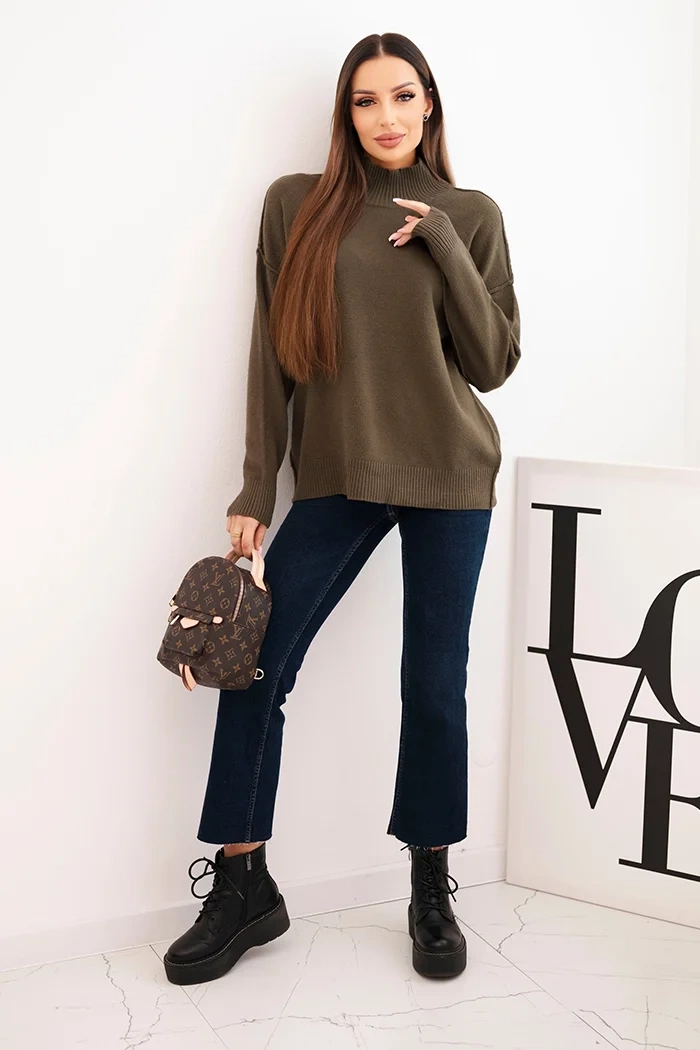 Modelis turi pusiau golfo apykaklę, kuri švelniai apgaubia kaklą ir suteikia elegancijos. Šoninės skeltos suteikia lengvumo ir leidžia megztiniui puikiai derėti tiek su džinsais, tiek su leginsais, tiek su sijonu.