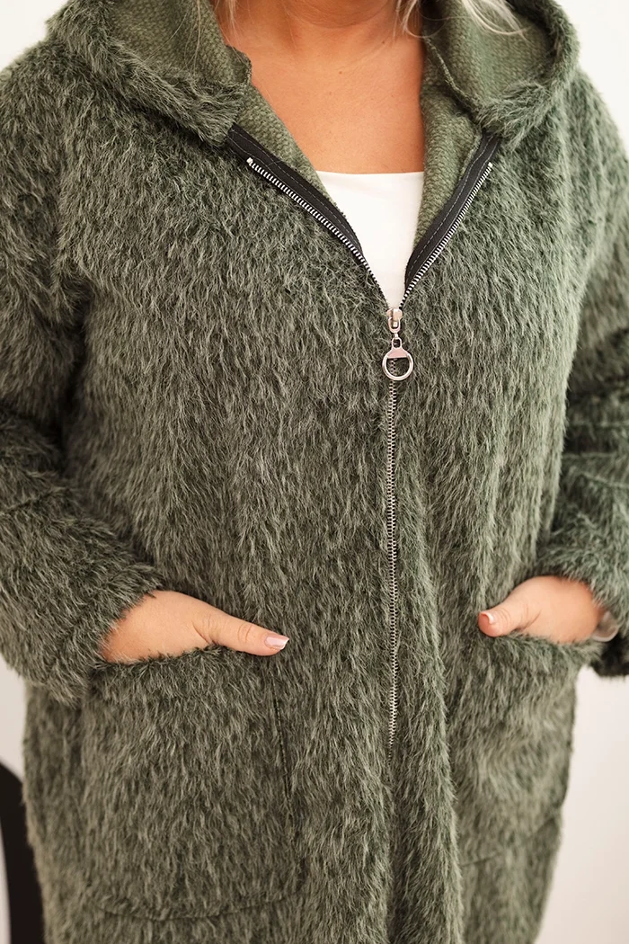 Moteriškas Plus Size paltas iš viskozės su užtrauktuku ir gobtuvu khaki