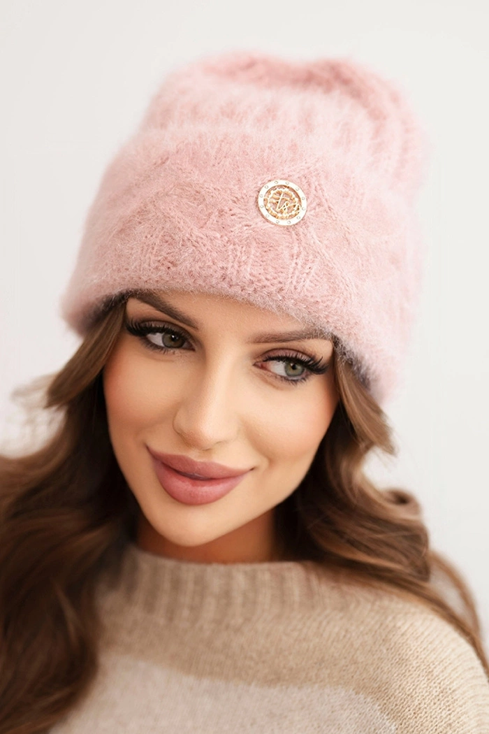 Moteriška pūkuota viskozės raižyta kepurė su dekoratyviniu metaliniu mygtuku pudros rožinė