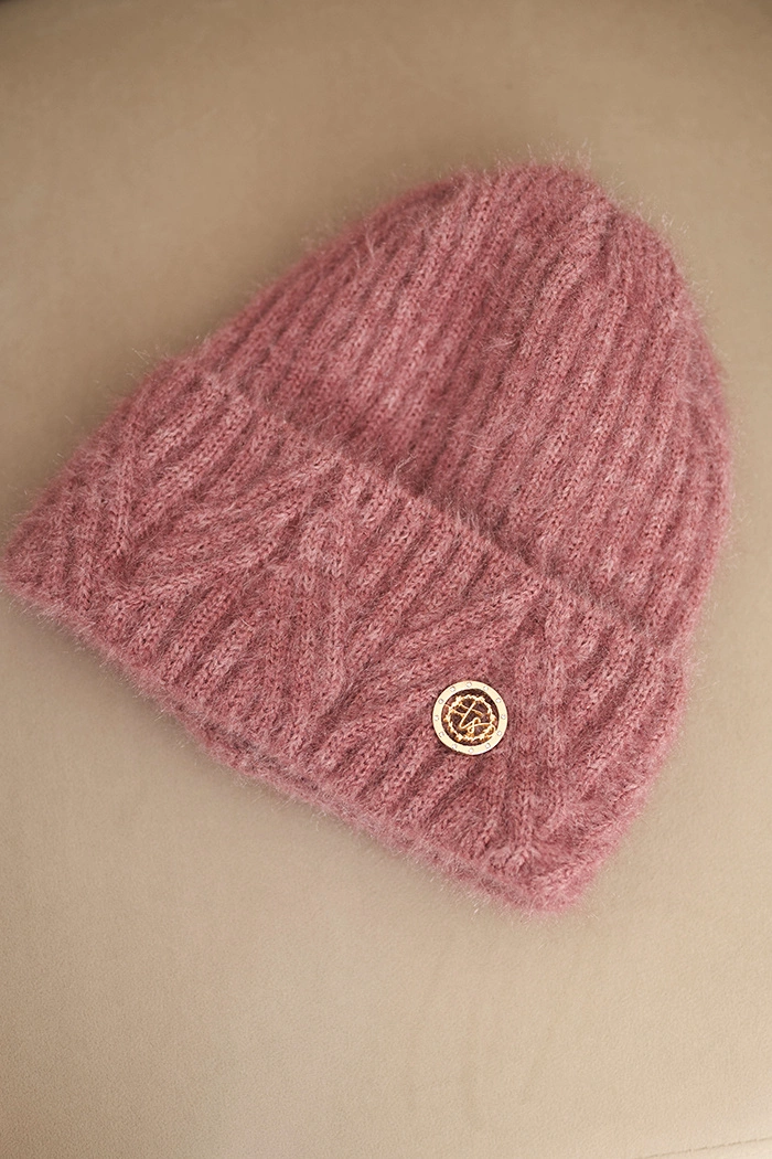 Skrybėlė papuošta elegantišku auksiniu mygtuku priekyje, kuris suteikia jai išskirtinį charakterį. Švelni pastelinių spalvų paletė puikiai dera su moteriškomis žiemos stilizacijomis.