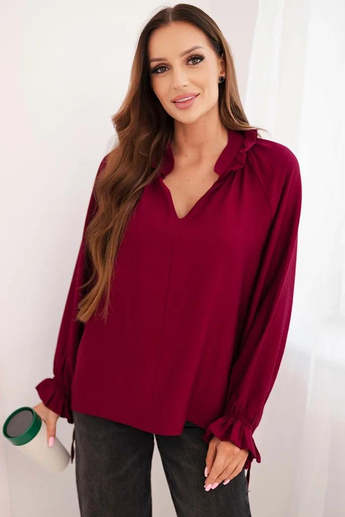 Moteriška bluzka iš viskozės su V formos iškirpte ir raišteliais prie rankovių slyvų