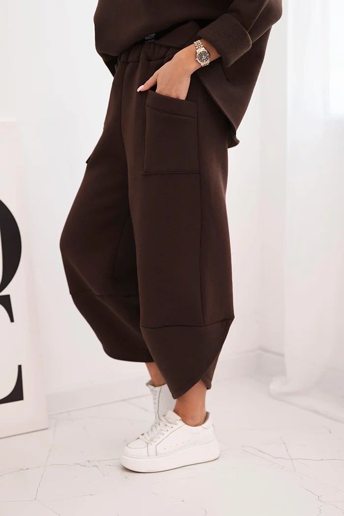 Moteriškas džemperių komplektas iš storesnio audinio su plačiomis kelnėmis rudas