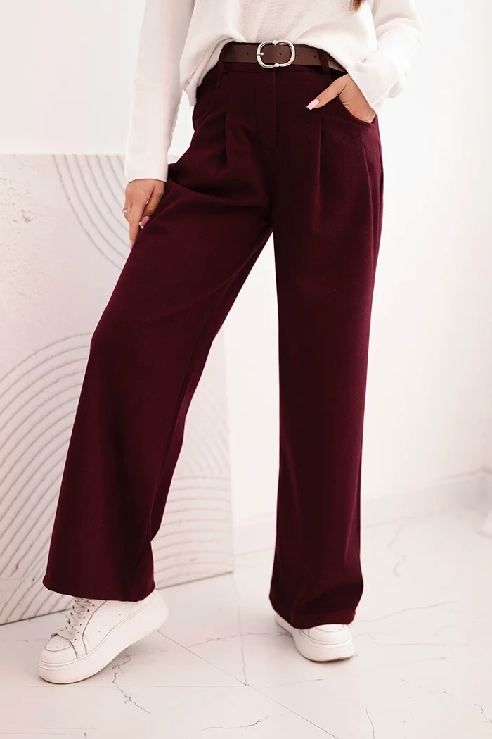 Moteriškos kelnės su plačiomis kojomis ir diržu bordinės