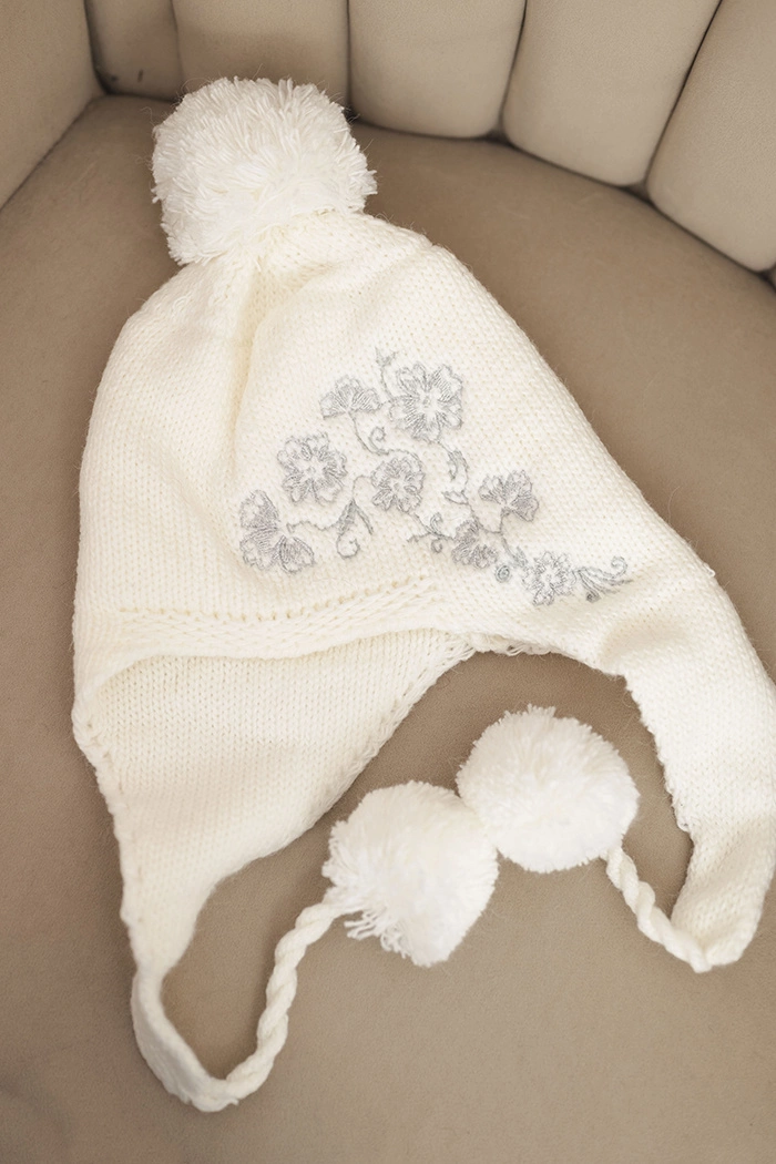 Šilta ir stilinga ausinė kepurė su mielais pomponais ir subtiliu, siuvinėtu raštu. Modelis puikiai tinka žiemai – užtikrina komfortą, saugo ausis nuo vėjo ir traukia akį originaliu dizainu.