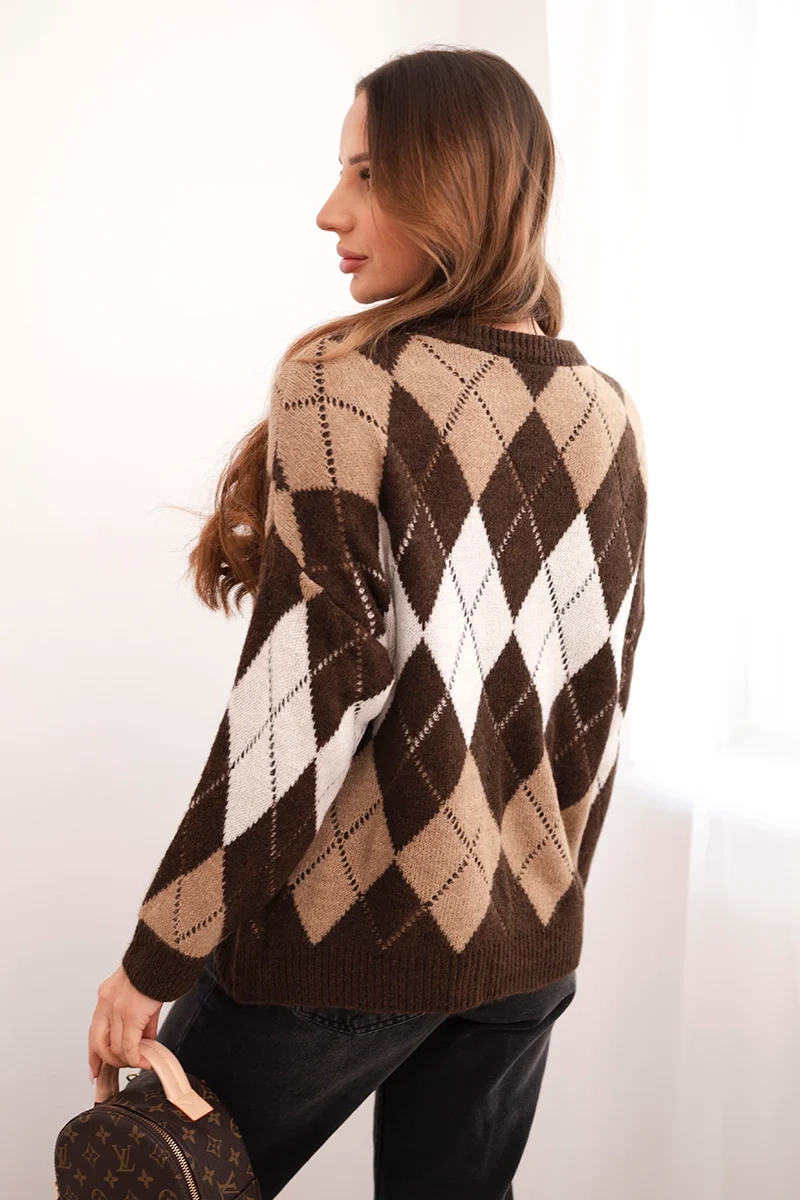 Moteriškas megztinis rombais su subtiliu ažiūru yra idealus klasikos ir modernaus stiliaus derinys. Jis išsiskiria geometriniu raštu madingose spalvose ir subtiliais perforuotais akcentais, kurie suteikia lengvumo ir moteriškumo. Klasikinis, paprastas siluetas su apvaliu iškirpimu užtikrina, kad megztinis puikiai krinta ant figūros ir tinka įvairioms stilizacijoms – tiek kasdieninėms, tiek elegantiškesnėms. Minkšta medžiaga su vilnos ir viskozės priedu užtikrina komfortą vilkint ir apsaugą nuo šalčio. Tai idealus pasirinkimas rudeniui ir žiemai!
