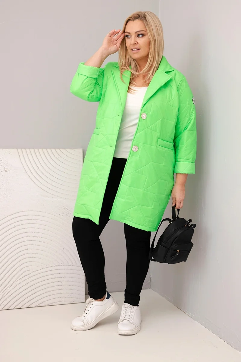 Moteriška plus size pūsta striukė su dekoratyviniais mygtukais ir apykakle žalias neonas