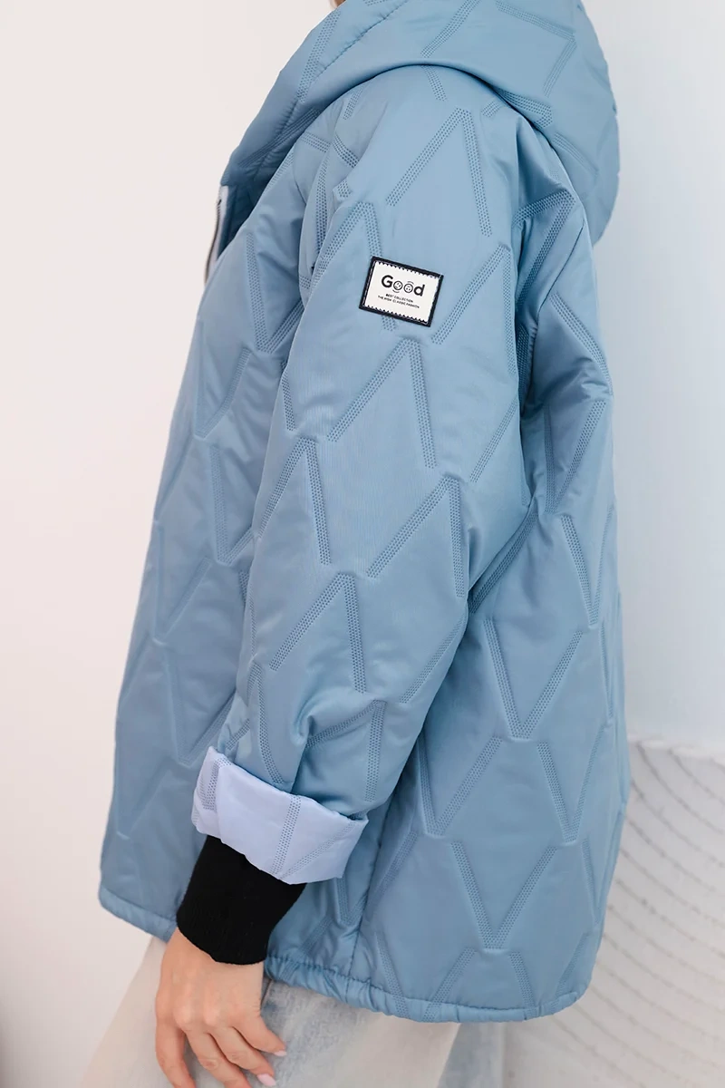 Pavasarinė moterų pamušalu striukė su gobtuvu ir džinsiniu užtrauktuku mėlyna