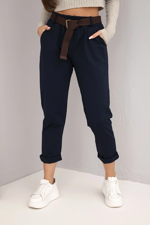Madingi ir patogūs moteriški kelnės su diržu yra idealus pasirinkimas moterims, vertinančioms stilių ir komfortą. Pagaminti iš aukštos kokybės medžiagos, užtikrina judėjimo laisvę ir puikų pritaikymą prie silueto. Turi elastingą juosmenį ir praktišką diržą, kuris akcentuoja liemenį. Jų klasikinis siluetas su suknegtu klešnės kraštu leidžia jas derinti tiek prie kasdienių, tiek prie elegantiškesnių stilių. Puikiai tiks su marškiniais arba lengvu megztiniu. Dydis yra universali ir tiks ponios, turinčios S, M arba L dydį.
