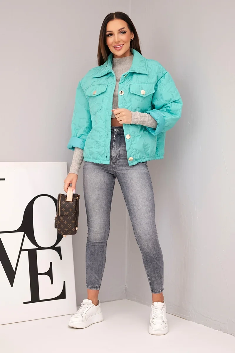 Pavasarinė moteriška pamušalu striukė su gėlių raštu mėtų