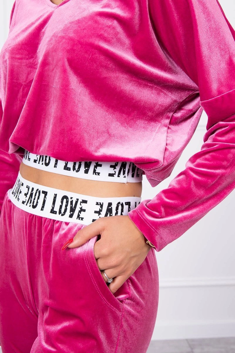 Prezentujemy Państwu komplet bluzy i spodni. Komplet wykonany z weluru. Bluza z kapturem i dekoltem w kształcie litery V. U dołu bluzy znajduje się wszyta taśma z napisem. Spodnie z kieszeniami oraz taśmą w pasie. Komplet wykonany jest z wysokiej jakości materiału. Rozmiar jest uniwersalny i będzie odpowiedni dla Pań w rozmiarze S, M lub L.