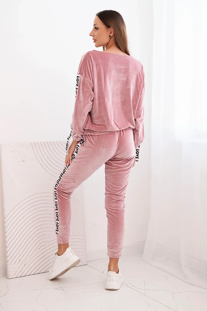 Prezentujemy Państwu komplet bluzy i spodni. Komplet wykonany z weluru. Bluza posiada taśmy z napisem Love. Spodnie z kieszeniami oraz wiązanie w pasie. Bardzo modny i stylowy komplet. Komplet wykonany jest z wysokiej jakości materiału. Rozmiar jest uniwersalny i będzie odpowiedni dla Pań w rozmiarze S, M lub L.