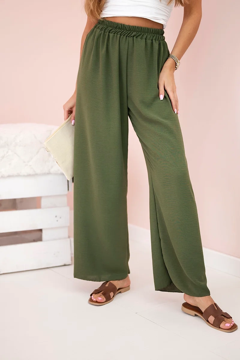 Spodnie z wiskozą z szeroką nogawką to wyjątkowy element garderoby, który łączy w sobie komfort i elegancję. Wykonane z lekkiego i przewiewnego materiału wiskozy, te spodnie gwarantują nie tylko swobodę ruchów, ale także zapewniają uczucie lekkości i świeżości przez cały dzień. Szeroka nogawka nadaje spodniom charakterystyczny, luźny fason, który jest zarówno modny, jak i wygodny. Ten element sprawia, że spodnie prezentują się niezwykle stylowo i efektownie, dodając oryginalności każdej stylizacji. Uniwersalny design spodni z szeroką nogawką sprawia, że doskonale pasują one do różnych okazji i stylizacji. Możesz nosić je zarówno do codziennych, luzackich outfitów, jak i do bardziej eleganckich zestawów na spotkania biznesowe czy wieczorne wyjścia. Spodnie z wiskozy z szeroką nogawką to idealny wybór dla kobiet, które cenią sobie wygodę i styl. Dzięki swojemu uniwersalnemu designowi i wysokiej jakości wykonania, te spodnie stanowią niezastąpiony element garderoby, który świetnie uzupełni każdą kolekcję ubrań. Rozmiar jest uniwersalny i będzie odpowiedni dla Pań noszących rozmiar  S, M lub L.