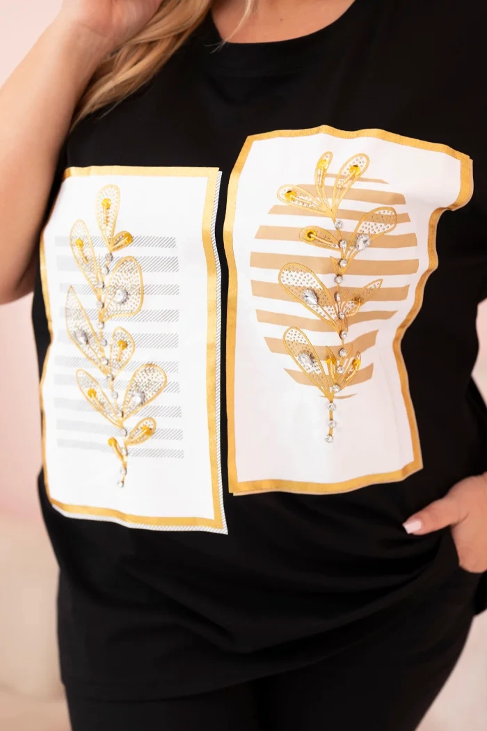 Bluzka damska bawełniana Plus Size z dżetami czarny + camelowy