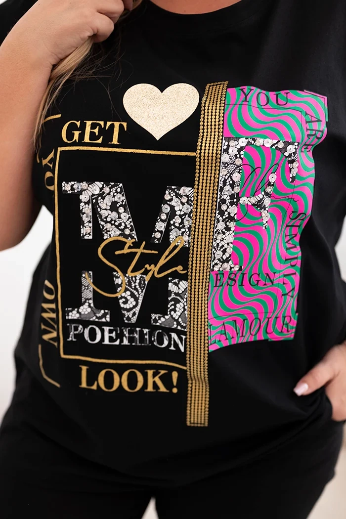 Jeśli szukasz komfortu, stylu i odrobiny błysku w jednym – ta bluzka damska z nadrukiem i cekinami Plus Size będzie doskonałym wyborem! Wyróżnia ją ciekawy, modny print z połyskującymi detalami oraz aplikacjami, które przyciągają wzrok i dodają charakteru każdej stylizacji. Krój oversize zapewnia swobodę ruchów i doskonale maskuje niedoskonałości sylwetki, a krótki rękaw sprawia, że idealnie sprawdzi się w cieplejsze dni. Świetnie prezentuje się zarówno w połączeniu z jeansami, jak i legginsami – idealna na codzienne wyjścia, spotkania z przyjaciółmi czy luźne dni w pracy. Model dedykowany Paniom noszącym rozmiary Plus Size – XXL, XXXL i większe.