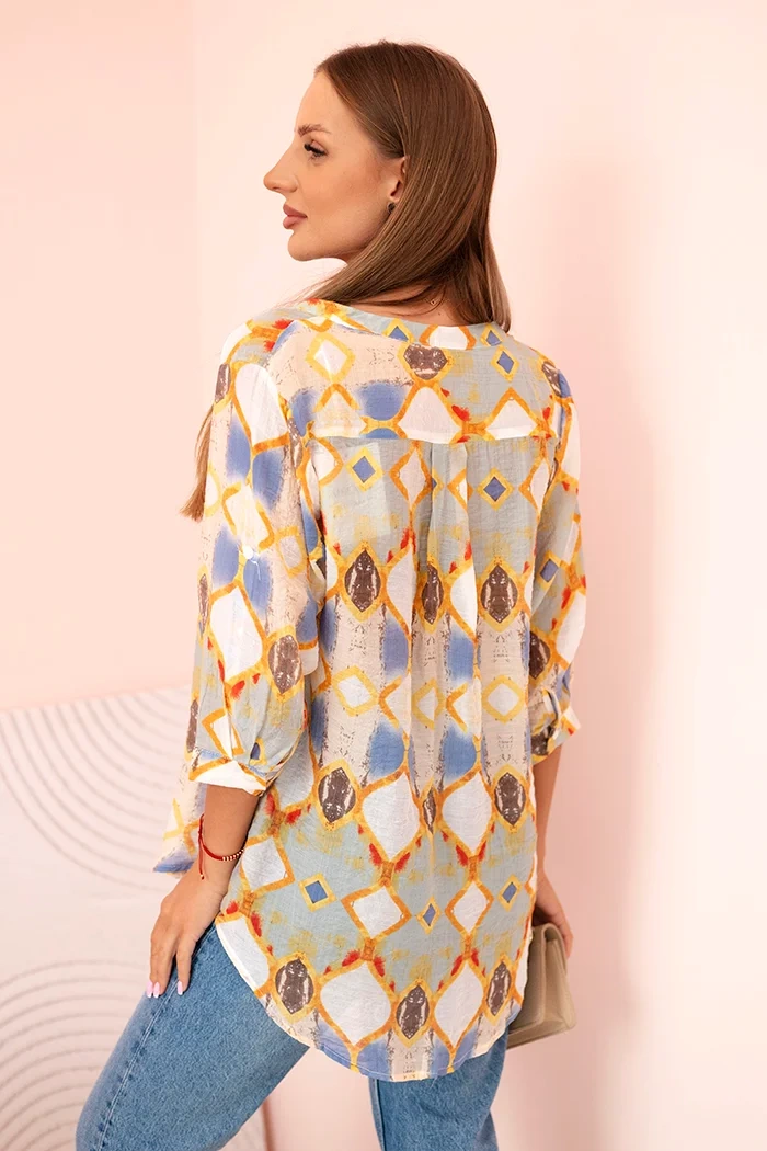 Kolorowa koszula damska z rękawem 3/4 to idealna propozycja na sezon wiosenno-letni. Geometryczny wzór w modnych odcieniach sprawia, że całość prezentuje się świeżo. Model posiada klasyczne zapięcie na guziki oraz praktyczną kieszonkę na piersi, co nadaje jej luźnego, casualowego charakteru. Zaokrąglony dół koszuli świetnie układa się na sylwetce, a dekolt w serek optycznie wysmukla szyję. Koszula wykonana została z przyjemnej w dotyku mieszanki naturalnych materiałów: wiskozy, bawełny i jedwabiu, co gwarantuje wygodę oraz przewiewność nawet w cieplejsze dni. Doskonała do noszenia na co dzień, do pracy, jak i na spotkania w gronie znajomych.