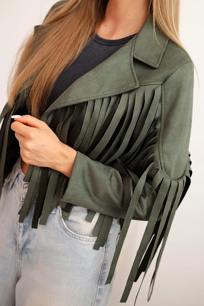 Kurtka damska z frędzlami to wyjątkowy model, który przyciąga spojrzenia i dodaje stylizacji charakteru. Wykonana z miękkiego materiału przypominającego zamsz, idealnie wpisuje się w najnowsze trendy boho i western. Krótki krój pięknie podkreśla sylwetkę, a efektowne frędzle wzdłuż rękawów i frontu nadają jej swobodnego, stylowego wyglądu. Świetnie sprawdzi się zarówno na co dzień, jak i podczas festiwali czy spotkań w plenerze. Ten model to doskonały wybór dla kobiet ceniących sobie unikalny styl i wygodę. Możesz nosić ją zarówno do jeansów, jak i do sukienek, tworząc oryginalne i modne stylizacje. Rozmiar jest uniwersalny i będzie odpowiedni dla Pań w rozmiarze S, M lub L.