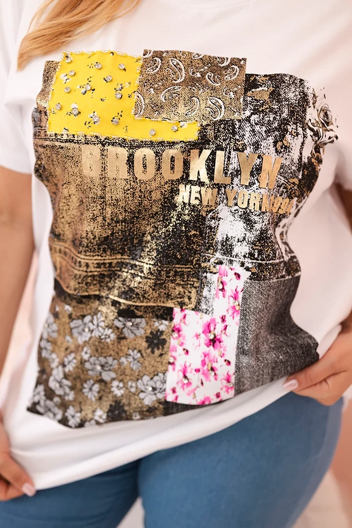 Jeśli szukasz wygodnej, a jednocześnie oryginalnej bluzki na co dzień – ta propozycja z pewnością Cię zainteresuje! Bluzka damska z krótkim rękawem ozdobiona kolorowym nadrukiem w stylu patchworku to idealne połączenie komfortu i miejskiego stylu. Przód zdobi ciekawy, kontrastowy print z motywem "Brooklyn New York", który nadaje całości nowoczesnego charakteru. Model ten sprawdzi się zarówno w casualowych stylizacjach z jeansami, jak i jako wygodna baza pod ramoneskę czy kardigan. Dzięki luźnemu fasonowi świetnie układa się na sylwetce, a przyjemny w dotyku materiał z przewagą bawełny zapewnia komfort noszenia przez cały dzień. Model dedykowany Paniom noszącym rozmiary Plus Size – XXL, XXXL i większe.