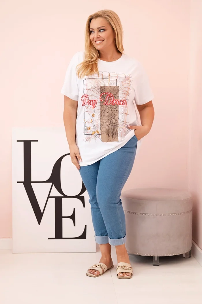 Bluzka damska bawełniana Plus Size z nadrukiem Day Dream biały + camelowy