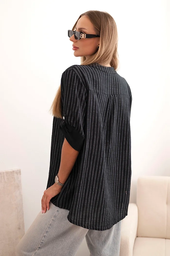 Ta bluzka damska to idealny wybór na ciepłe dni, łączący lekkość z komfortem noszenia. Wykonana w 100% z naturalnej bawełny, zapewnia przewiewność i miękkość, dzięki czemu sprawdzi się zarówno na co dzień, jak i podczas letnich wyjść. Charakterystyczny fason z luźnym krojem pozwala na swobodę ruchów, a pasek na rękawie umożliwia podwinięcie rękawów i stylizację według własnych potrzeb. Praktyczna kieszonka na przodzie dodaje całości nieformalnego, casualowego uroku. Bluzka bez kołnierzyka z lekkim dekoltem na guziki świetnie wpisuje się w letnie trendy. Produkcja Włoska gwarantuje wysoką jakość wykonania i dbałość o detale. Rozmiar jest uniwersalny i będzie odpowiedni dla Pań w rozmiarze S, M lub L.