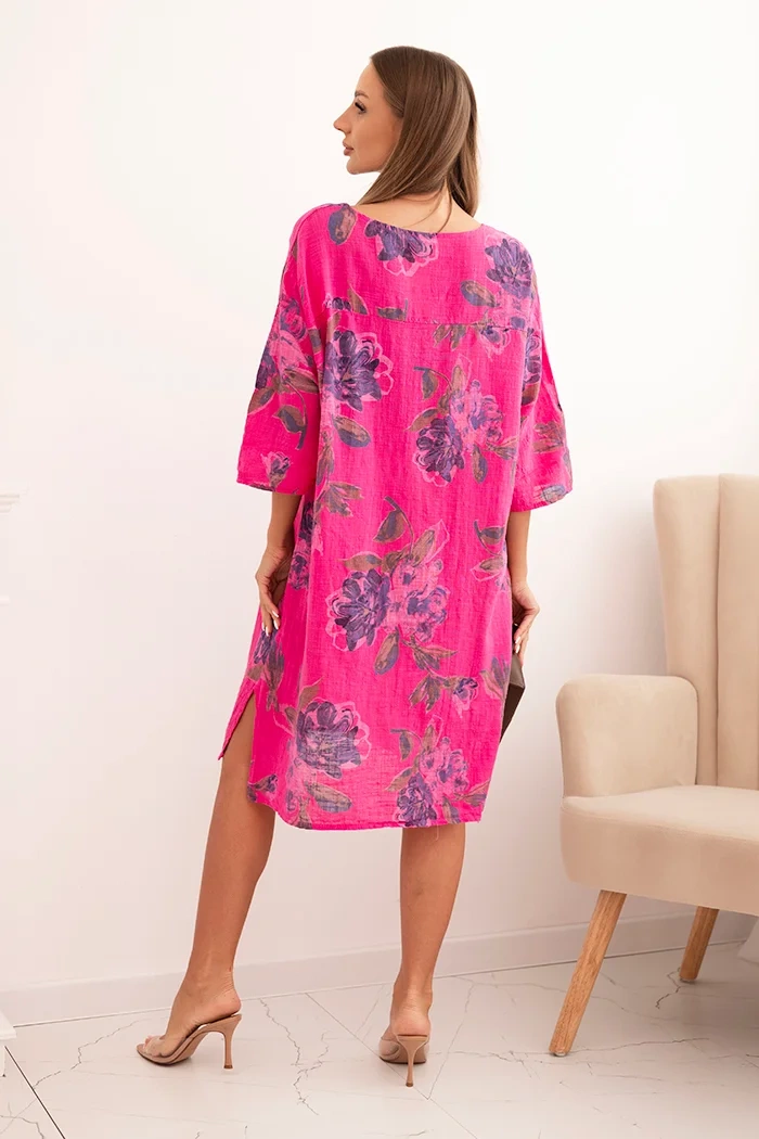Sukienka damska bawełniana z kwiatowym wzorem i rękawem 3/4 fuksja