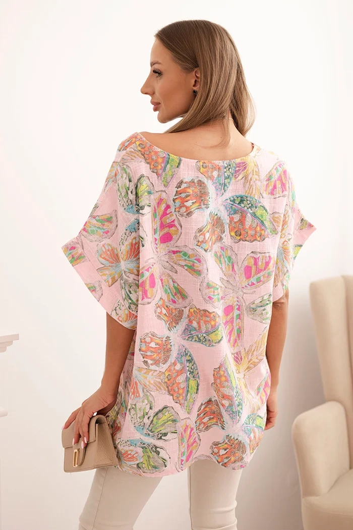 Luźna, przewiewna i bardzo kobieca – ta bluzka damska z krótkim rękawem to doskonały wybór na ciepłe dni. Wyróżnia się oryginalnym motywem motyli, który przyciąga wzrok i dodaje stylizacji lekkości. Wykonana w 100% z naturalnej bawełny, zapewnia maksymalny komfort noszenia oraz swobodę ruchów. To idealna propozycja na co dzień, do pracy, na spacer czy letnie spotkania z przyjaciółmi. Dzięki luźnemu fasonowi świetnie sprawdzi się zarówno w zestawieniu z jeansami, jak i spódnicą. Produkcja włoska gwarantuje wysoką jakość wykonania oraz dbałość o każdy detal. Rozmiar jest uniwersalny i będzie odpowiedni dla Pań w rozmiarze S, M lub L.