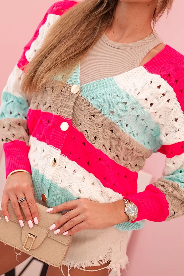 Ten uroczy kardigan damski w kolorowe paski to idealna propozycja na każdą porę roku. Wykonany z miękkiego, przyjemnego w dotyku akrylu, świetnie sprawdzi się zarówno na chłodniejsze dni, jak i jako stylowe uzupełnienie wiosennych stylizacji. Ażurowy wzór nadaje mu lekkości i kobiecego uroku, a klasyczny dekolt w serek pięknie podkreśla szyję. Kardigan zapinany jest na guziki, co dodaje mu praktyczności i pozwala nosić go na wiele sposobów – zarówno rozpięty, jak i zapięty. To doskonały wybór dla kobiet ceniących wygodę, kolor i modny wygląd. Dzięki pastelowym barwom łatwo dopasujesz go do wielu stylizacji – od casualowych po bardziej romantyczne zestawy. Świetnie wygląda z jeansami, spódnicą czy sukienką. Rozmiar jest uniwersalny i będzie odpowiedni dla Pań w rozmiarze S, M lub L.