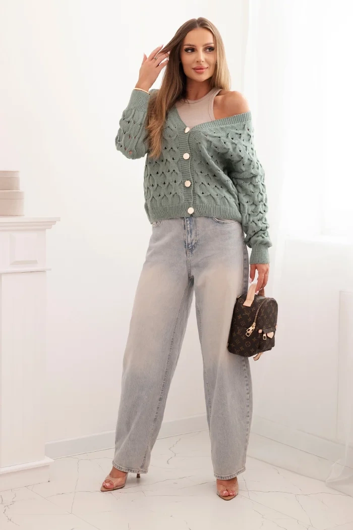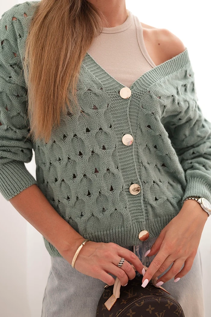 Sweter damski ażurowy z dekoltem V i złotymi guzikami ciemny miętowy