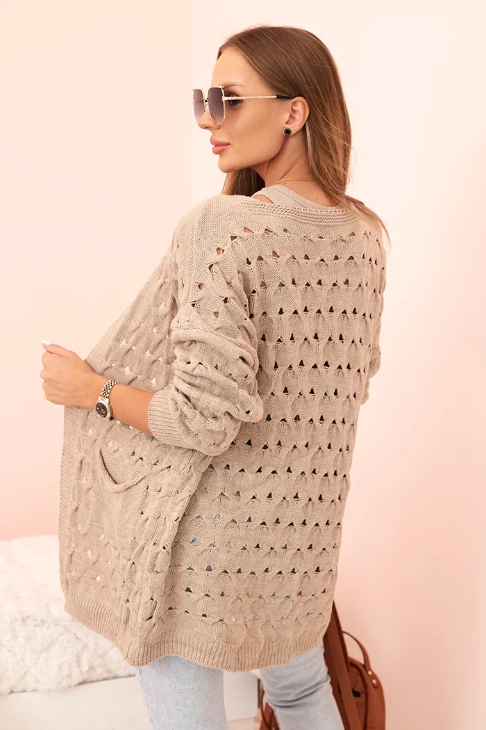 Kardigan damski ażurowy z kieszeniami ciemny beżowy