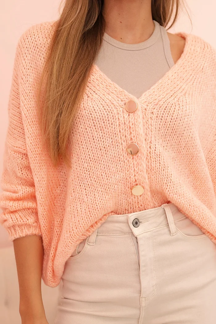 Ten sweter damski z dekoltem w serek to doskonały wybór dla kobiet ceniących wygodę, styl i uniwersalność. Wykonany z miękkiego i przyjemnego w dotyku materiału, świetnie sprawdzi się w chłodniejsze dni – zarówno do codziennych stylizacji, jak i bardziej eleganckich zestawów. Oversize’owy fason z obniżoną linią ramion i klasycznym zapięciem na guziki podkreśla luźny, modny charakter kardiganu. To model, który z łatwością dopasujesz do jeansów, legginsów lub spódniczki – na spacer, do pracy lub wieczorne spotkanie. Delikatna struktura dzianiny dodaje mu lekkości, a zarazem sprawia, że jest ciepły i przyjemny w noszeniu. Rozmiar jest uniwersalny i będzie odpowiedni dla Pań w rozmiarze S, M lub L.
