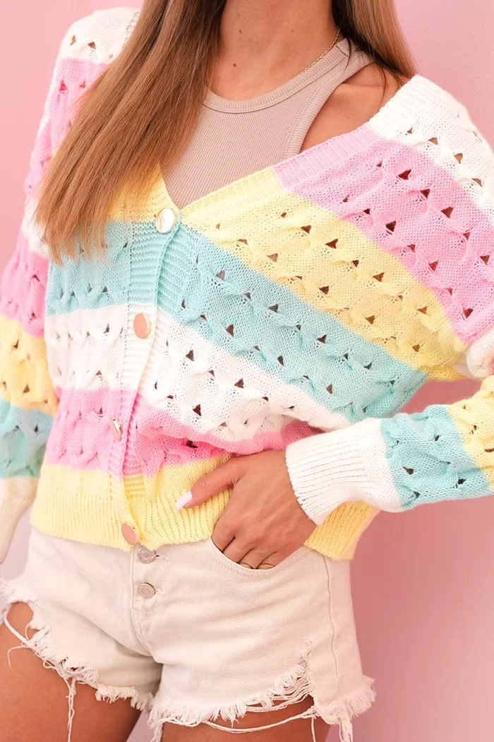 Ten uroczy kardigan damski w kolorowe paski to idealna propozycja na każdą porę roku. Wykonany z miękkiego, przyjemnego w dotyku akrylu, świetnie sprawdzi się zarówno na chłodniejsze dni, jak i jako stylowe uzupełnienie wiosennych stylizacji. Ażurowy wzór nadaje mu lekkości i kobiecego uroku, a klasyczny dekolt w serek pięknie podkreśla szyję. Kardigan zapinany jest na guziki, co dodaje mu praktyczności i pozwala nosić go na wiele sposobów – zarówno rozpięty, jak i zapięty. To doskonały wybór dla kobiet ceniących wygodę, kolor i modny wygląd. Dzięki pastelowym barwom łatwo dopasujesz go do wielu stylizacji – od casualowych po bardziej romantyczne zestawy. Świetnie wygląda z jeansami, spódnicą czy sukienką. Rozmiar jest uniwersalny i będzie odpowiedni dla Pań w rozmiarze S, M lub L.