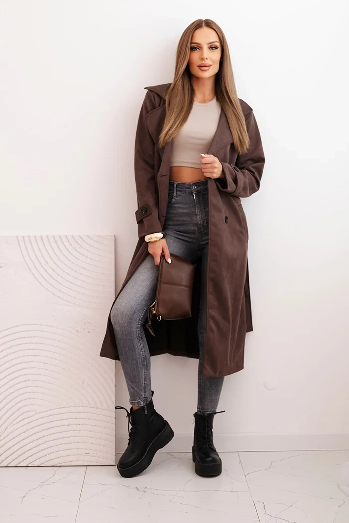 Elegancki płaszcz damski o klasycznym, wydłużonym kroju to doskonała propozycja na sezon jesienno-zimowy dla kobiet, które cenią styl i wygodę. Model wyposażony w szeroki kołnierz, praktyczne kieszenie oraz pasek w talii, który pięknie podkreśla sylwetkę. Długość za kolano oraz podwójne zapięcie na guziki dodają mu eleganckiego, ponadczasowego charakteru.