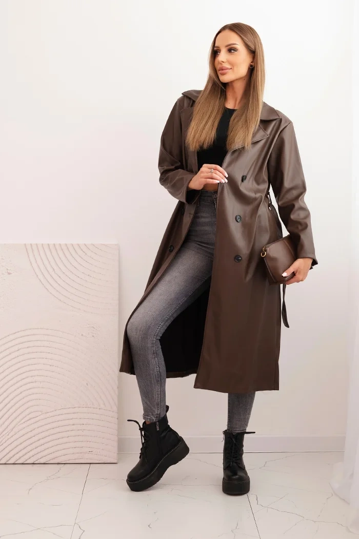 Trencz damski z ekoskóry z paskiem i kołnierzem brązowy