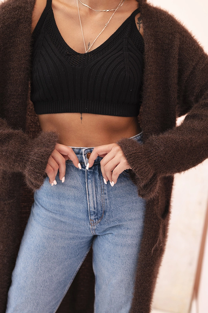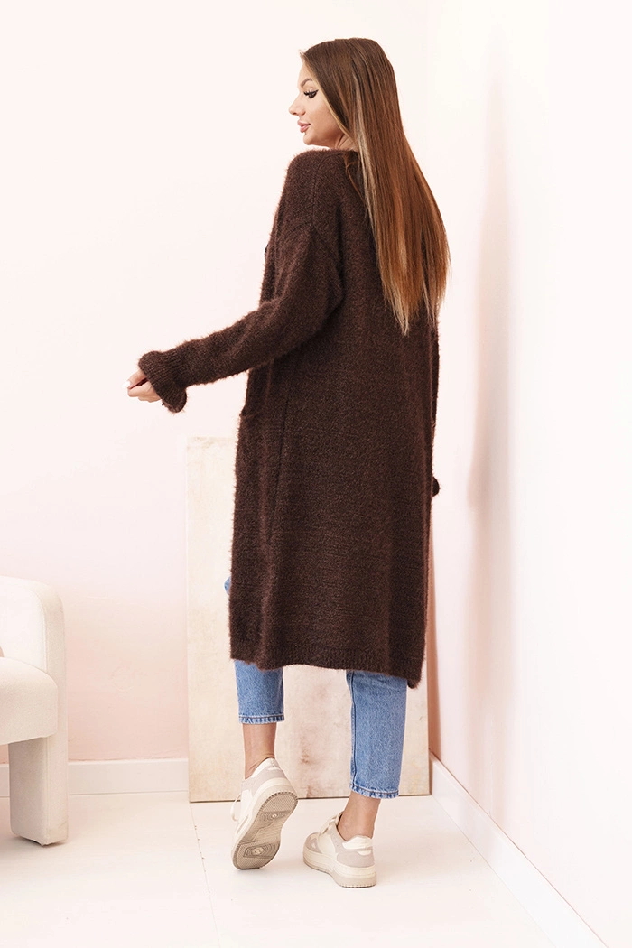 Kardigan damski z moheru o długim kroju z kieszeniami brązowy