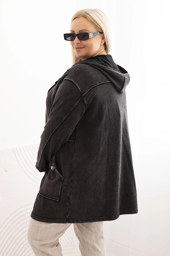 Stylowa bluza damska Plus Size o efekcie dekatyzowania to propozycja dla kobiet, które lubią wygodę i niebanalny styl. Model w luźnym fasonie zapewnia swobodę ruchu, a dzięki bawełnianej tkaninie świetnie sprawdzi się na co dzień. Bluza posiada kaptur z trokami, suwak na całej długości oraz dwie pojemne kieszenie z ozdobnymi guzikami, które dodają charakteru. Surowo wykończone rękawy i dół podkreślają jej nowoczesny styl.
