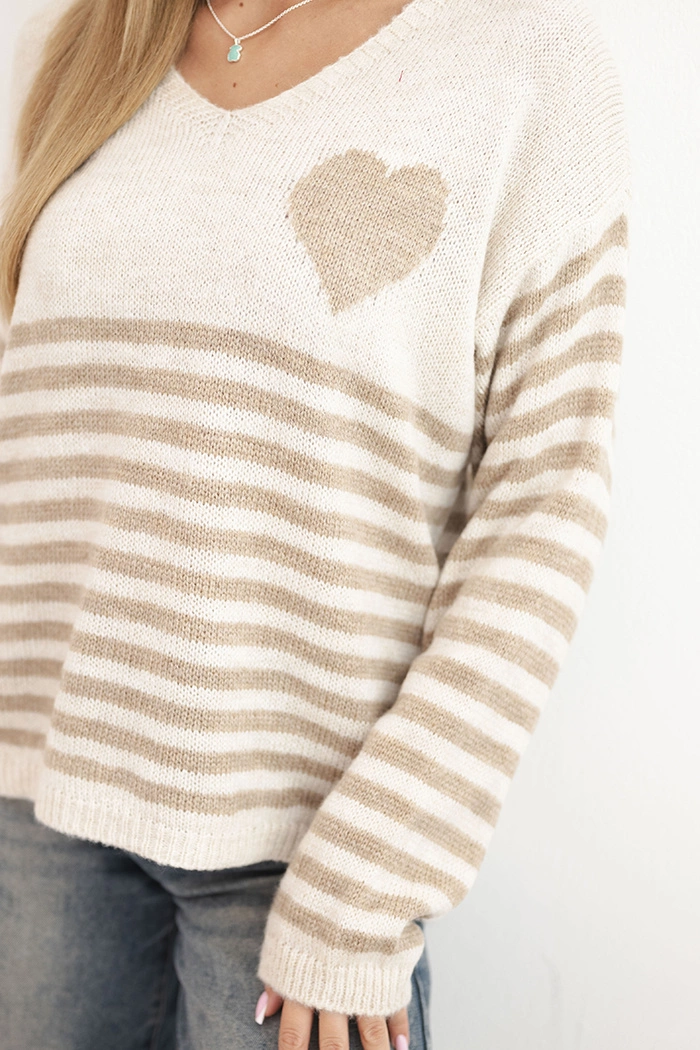 Sweter damski w paski z sercem z moherem i dekoltem V camelowy