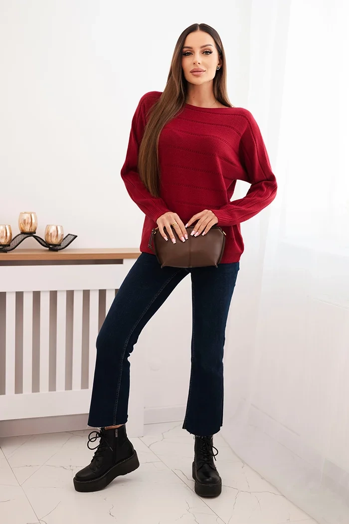 Sweter damski wiskozowy z ażurowym wzorem i długim rękawem bordowy
