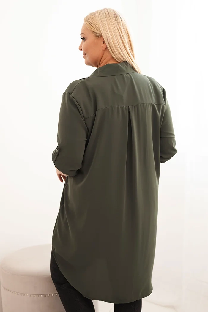 Sukienka damska koszulowa Plus Size z dłuższym tyłem i podwijanym rękawem khaki